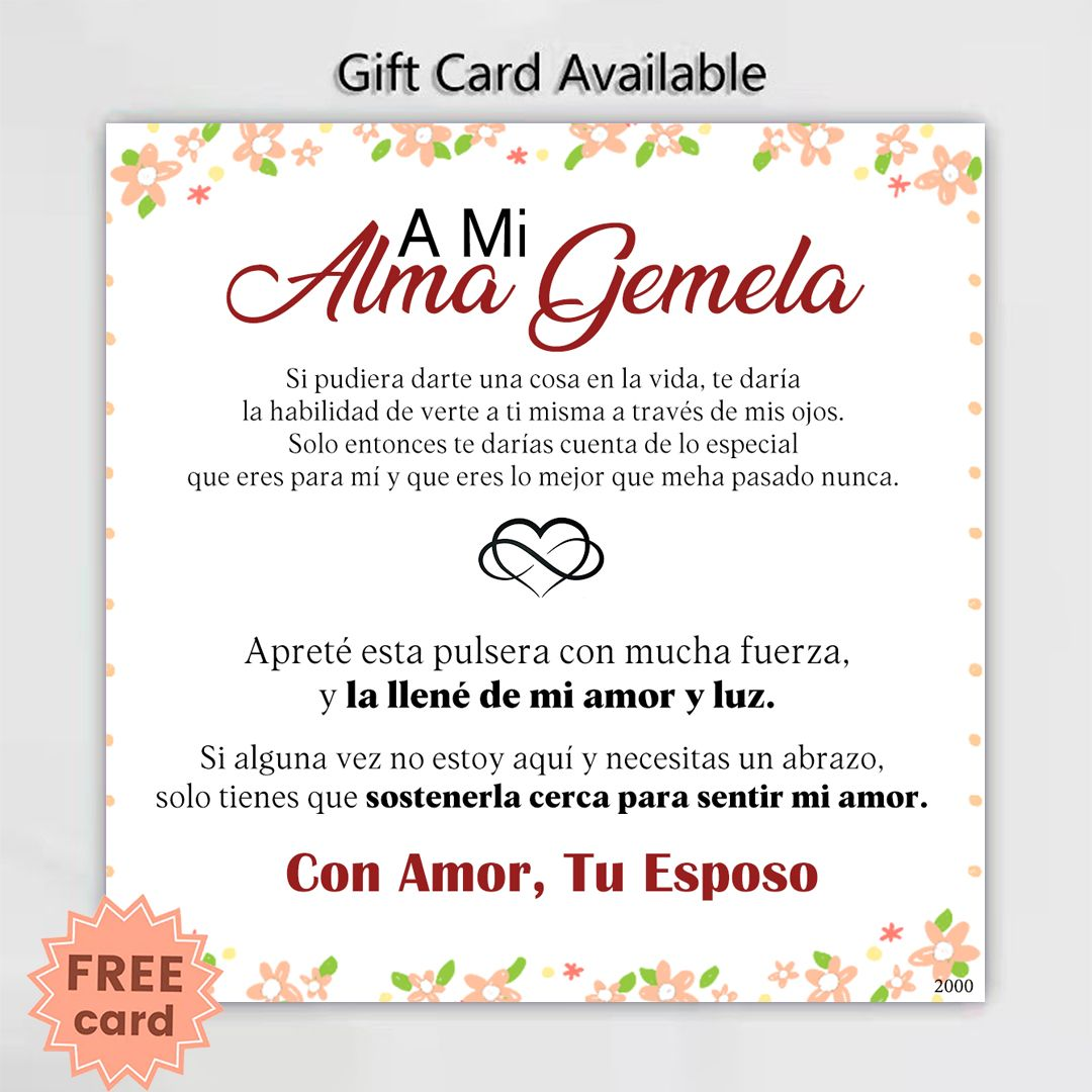 Incluye: Tarjeta inspiradora en español “A Mi Alma Gemela” con mensaje de amor personalizado.